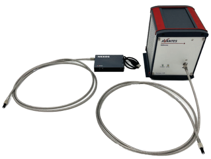 另一款為迷你型光譜儀AvaSpec-NXS2048CL,通稱為NEXOS?。它配備2048像素CMOS探測(cè)器,覆蓋波長(zhǎng)范圍200-1100nm。實(shí)驗(yàn)使用的其他附件包括兩根600μm芯徑光纖和兩個(gè)余弦校正器。
