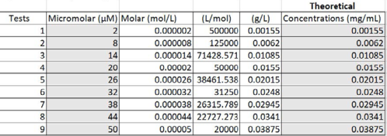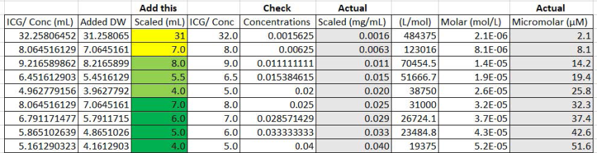 實(shí)驗(yàn)中,我們使用蒸餾水作為溶劑, 將μM轉(zhuǎn)換為mg/mL以獲得μM的對應(yīng)濃度。我們將2~50μM范圍均分成九組濃度,并在表中得到了以 mg/mL 為單位的理論濃度值(圖2)。圖3為ICG溶于蒸餾水的濃度。