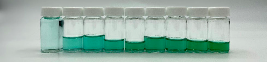 如圖4所示,每組實(shí)驗(yàn)分別添加不同劑量的蒸餾水稀釋,以獲得濃度范圍在2 ~50μM的溶液。表中黃色高亮處、淺綠色高亮處、深綠色高亮處的實(shí)驗(yàn)分別添加了濃度不同的ICG基礎(chǔ)溶液。最后,我們通過計(jì)算得到了真實(shí)濃度值,將其轉(zhuǎn)換回以μM為單位的數(shù)據(jù)。下方圖5所示的是不同濃度的 ICG 溶液樣品。