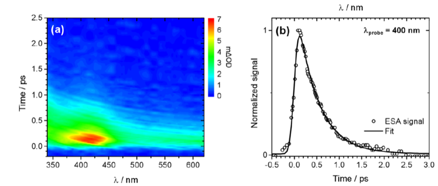 圖 5: (a) Waterfall plot of TAS spectra of Ade[-H] in D-2O excited with a 266 nm pump laser as a function of delay time, and (b) normalized decay kinetics at 400nm.[2]