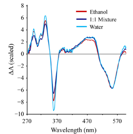 圖 6: TAS spectra of CNCbl in water, ethanol, and a 1:1 mixture of water and ethanol. Excited with a 266 nm pump laser [3].
