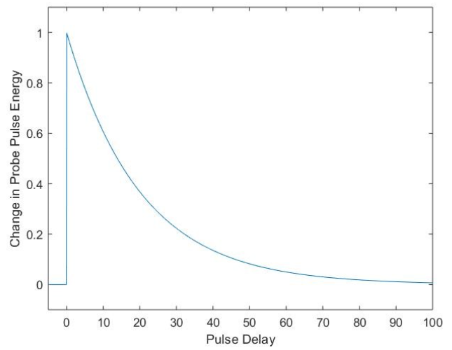使用超快激光進(jìn)行瞬態(tài)吸收光譜測(cè)試有許多不同的方法,基本上依據(jù)泵浦探針。該方法需要兩束激光同時(shí)激發(fā)分析物并測(cè)量吸光度。首先,高強(qiáng)度的泵浦激光激發(fā)樣品中的部分分子到更高的能級(jí),從而改變了分子的居數(shù)差,降低了躍遷的吸收系數(shù)。然后,通過低強(qiáng)度的探針激光通測(cè)量樣品吸收。通過計(jì)算有無泵浦激光時(shí)探針激光的吸收差值,就可以確定吸收的變化。然后根據(jù)泵浦脈沖與探針脈沖的不同延遲時(shí)間系統(tǒng)重復(fù)此過程,測(cè)量發(fā)射探針脈沖能量的變化,如圖2所示。從這些數(shù)據(jù),我們現(xiàn)在可以建立能級(jí)躍遷動(dòng)力學(xué)的圖像,并確定自發(fā)壽命和其他瞬態(tài)效應(yīng)。