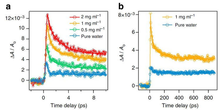 由馬克斯·普朗克研究所(the Max Planck Institute),漢堡大學(xué)(University of Hamburg),約阿尼納大學(xué)(University of Ioannina)和多倫多大學(xué)(University of Toronto)組成的聯(lián)合小組使用瞬態(tài)吸收光譜技術(shù)更好地解釋了氧化石墨烯的光還原過程[4]。在這項(xiàng)研究中,他們通過瞬態(tài)吸收光譜觀察了兩個(gè)重疊的衰減,一個(gè)發(fā)生在2 ps以下,另外一個(gè)發(fā)生在2 ps至250 ps之間,最終表明光還原過程是一個(gè)多步驟過程??焖偎p與氧化石墨烯離子化和產(chǎn)生水的溶劑化電子相關(guān),然后溶劑化電子與氧化石墨烯相互作用導(dǎo)致在緩慢衰變期間引起還原。 圖7中所示的數(shù)據(jù)是使用Avantes光纖耦合光譜儀收集的,并使用266 nm泵浦激光激發(fā)。