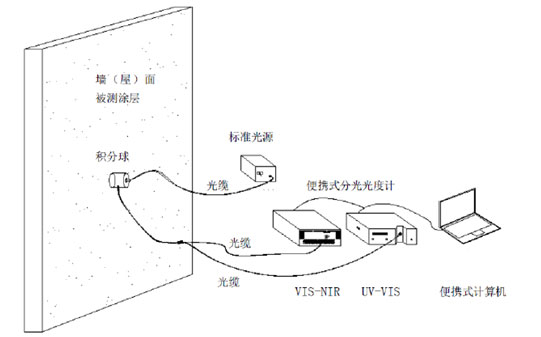 2. 測量原理和方法      根據(jù)JGJ/T287-2013《建筑熱反射涂料節(jié)能檢測標準》,我們開發(fā)了AvaSR-96型便攜式太陽光譜反射儀,儀器主機主要包括以下幾個部分:(1)       可見光通道光譜儀:用于測試350-1100nm的反射光譜;(2)       近紅外通道光譜儀:用于測試1000-2500nm的反射光譜;(3)       光源和積分球:鹵鎢燈光源,用于照明和采集反射光譜;(4)       手柄式探頭:用于光譜信號采集;(5)       計算機:用于數(shù)據(jù)采集和儀器控制;(6)       無線通信系統(tǒng):用于無線數(shù)據(jù)傳輸,方便遠程操作;(7)       供電系統(tǒng):大容量電池滿足戶外測量需求。