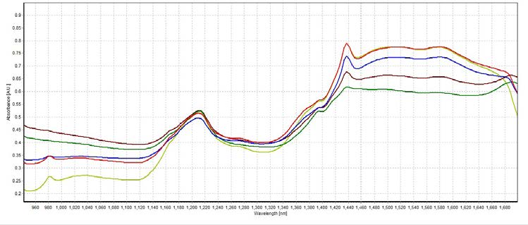 在1209.81 nm處,吸光度由高到低分別為:可可含量為78%的黑巧克力樣品,可可含量為92%的黑巧克力樣品,白巧克力樣品,廉價(jià)牛奶巧克力樣品。在1437.32 nm處,吸光度由高到低分別為:白巧克力,廉價(jià)牛奶巧克力,牛奶巧克力,可可含量為78%的黑巧克力樣品,可可含量為92%的黑巧克力樣品。由此可以假設(shè)這個(gè)峰值表示糖含量。