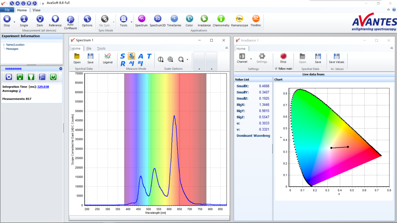 整個系統(tǒng)用NIST可溯源標準光源在特定的波長范圍做特定的輻射定標(μW/cm2/nm),定標后的系統(tǒng)可用AvaSoft-IRRAD軟件來測量并得到以下參數(shù):X, Y, Z, x, y, z, u, v, CRI、色溫、主波長、補色主波長、半高寬、峰值波長、色差ΔE等。此外,原始數(shù)據(jù)和色坐標也可以顯示。客戶可用Avantes提供的動態(tài)鏈接庫(DLL)可通過C#、C++及其他的編譯環(huán)境進行二次開發(fā)。