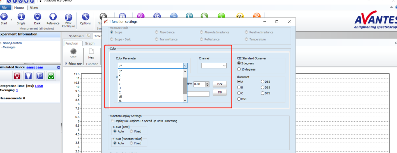 在AvaSoft-FULL軟件中的歷史通道功能,使我們可以很方便的監(jiān)視L*a*b值、XYZ值、色差Δu、Δv、ΔE色差等參數(shù)隨時間的變化情況,甚至我們還可以自定義一些參量,并觀察它們隨時間的變化,軟件也可以同時監(jiān)測多個參數(shù)隨時間的變化。