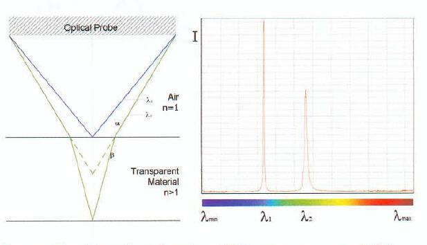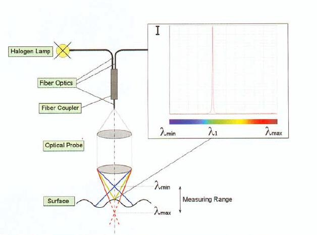 該系統(tǒng)主要由光譜儀、光源和光學探頭組成;光源通過多模光纖進入光學探頭,光學探頭將不同波長的光聚焦到透鏡上不同距離處形成色散,同時在透鏡上下表面不同波長的光形成自垂直產(chǎn)生反射光譜信號進入光學探頭傳輸進入光譜儀獲得不同波長的離焦量;然后通過軟件算法計算得到透鏡的中心厚度。